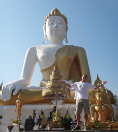 My last day in Chang Mai was a great one. I went up into the mountains and saw a beautiful Buddha that stood 30 feet high and was surrounded by other shrines and temples that were breathtaking. I had a chat with an old monk that told me I was a lucky man. He said that because of the old Buddha necklace that was given by me by Koko in Phi Phi island. KoKo told me it would bring me luck which I believe is something we create for ourselves, but what the heck. I also met a woman that was 95 years old and she walked around with the grace and poise of a 40 year old or less. Her smile was amazing even though she was missing a few teeth. She was surrounded by family that loved and respected her a lot I could tell. I was “lucky” enough to get a hug from her and she grabbed my hands and looked at me with these wise eyes. Being over here in a land where spirituality comes from within I could feel an ageless energy field when she touched my hands.